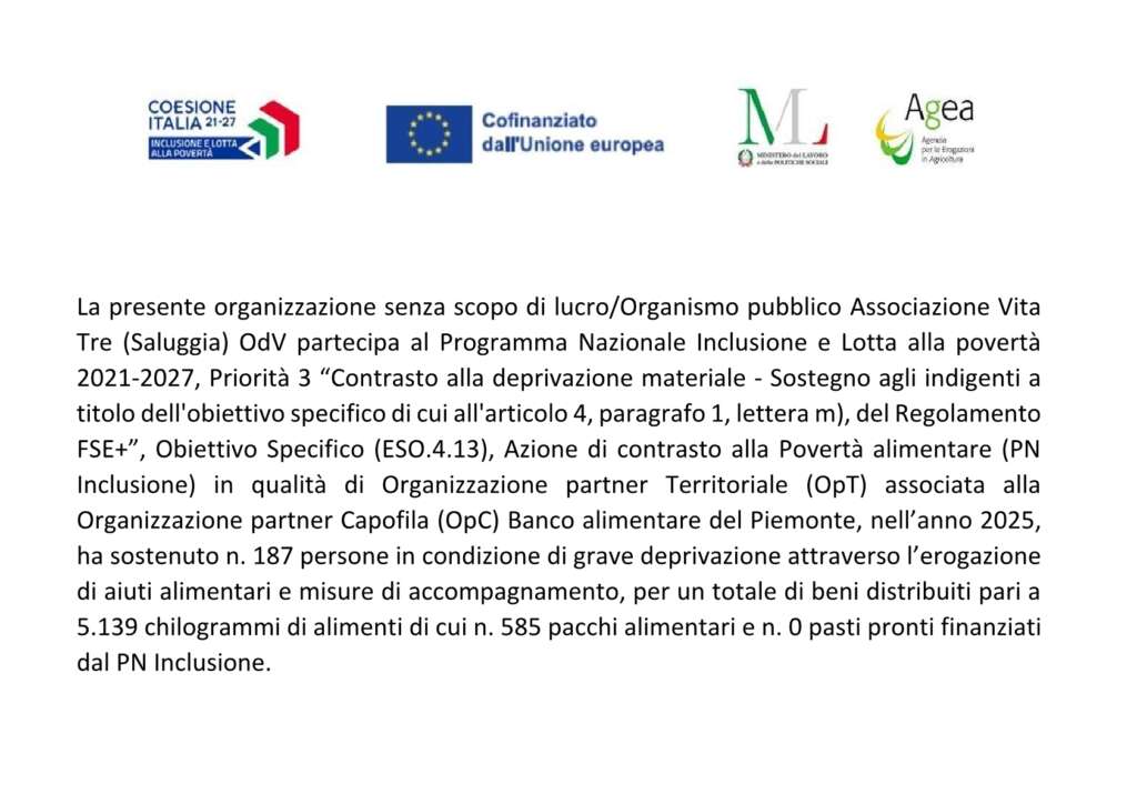 Continua la collaborazione pluridecennale di Vita Tre con il Banco Alimentare Onlus per la distribuzione di pacchi alimentari a nuclei famigliari indigenti di Saluggia. I vengono ritirati mensilmente dal magazzino del Banco a Moncalieri e ridistribuiti da volontari.
